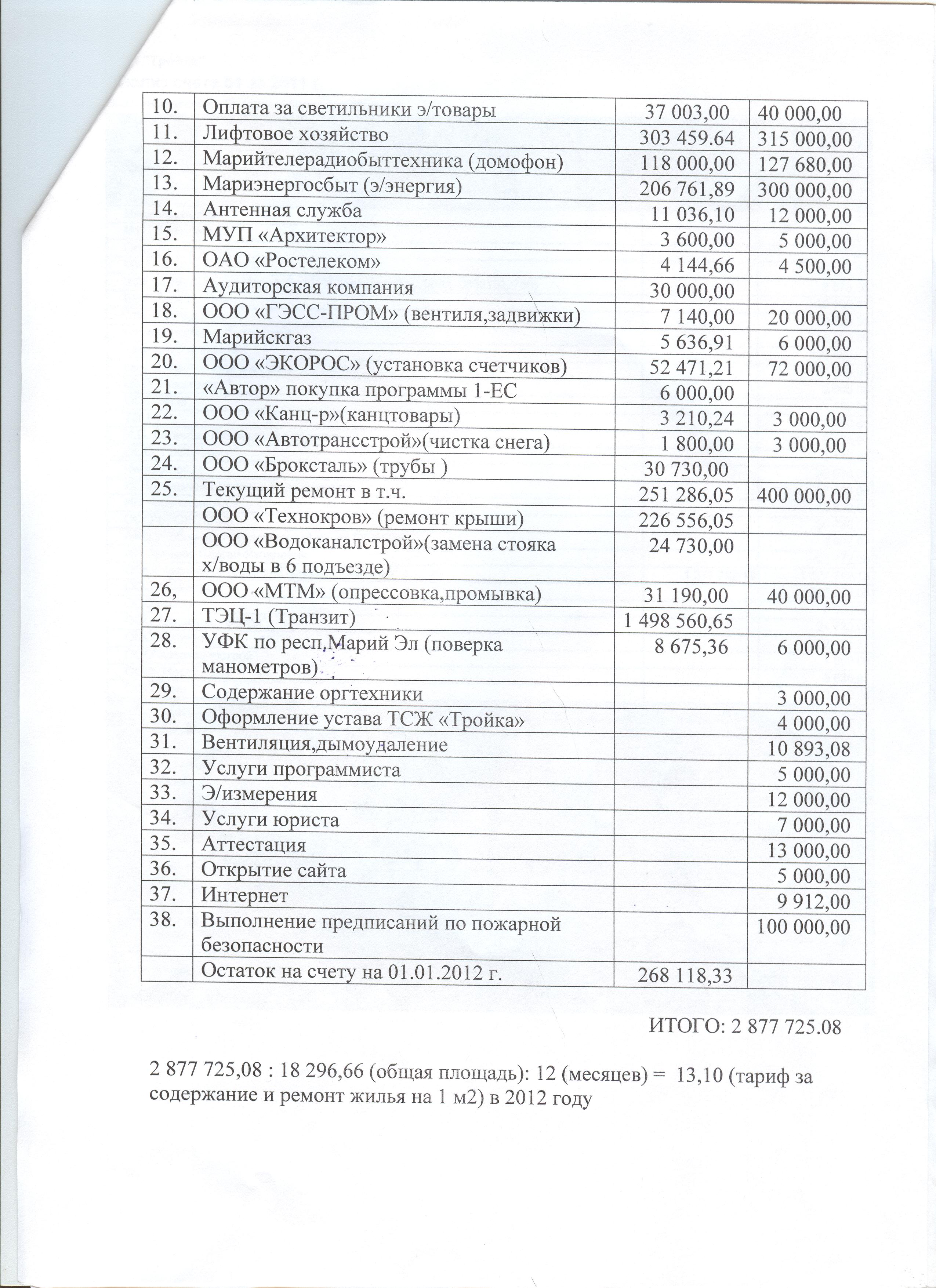 Смета расходов по содержанию и ремонту жилого фонда ТСЖ "Тройка" на 2012 год